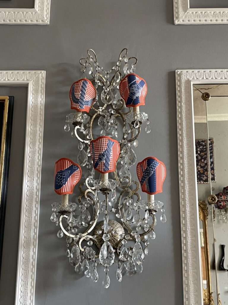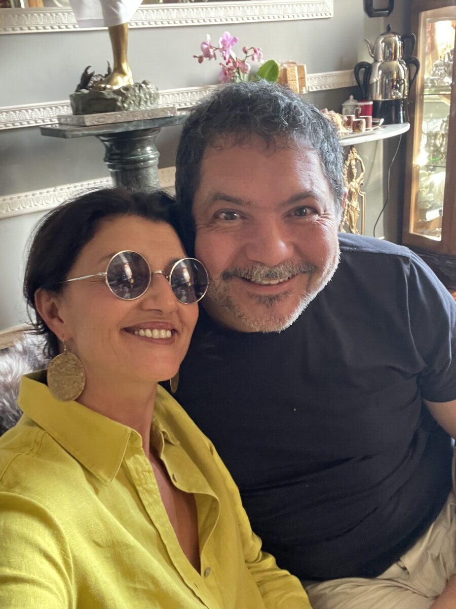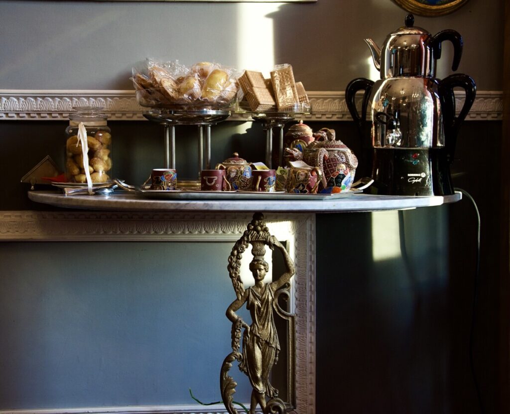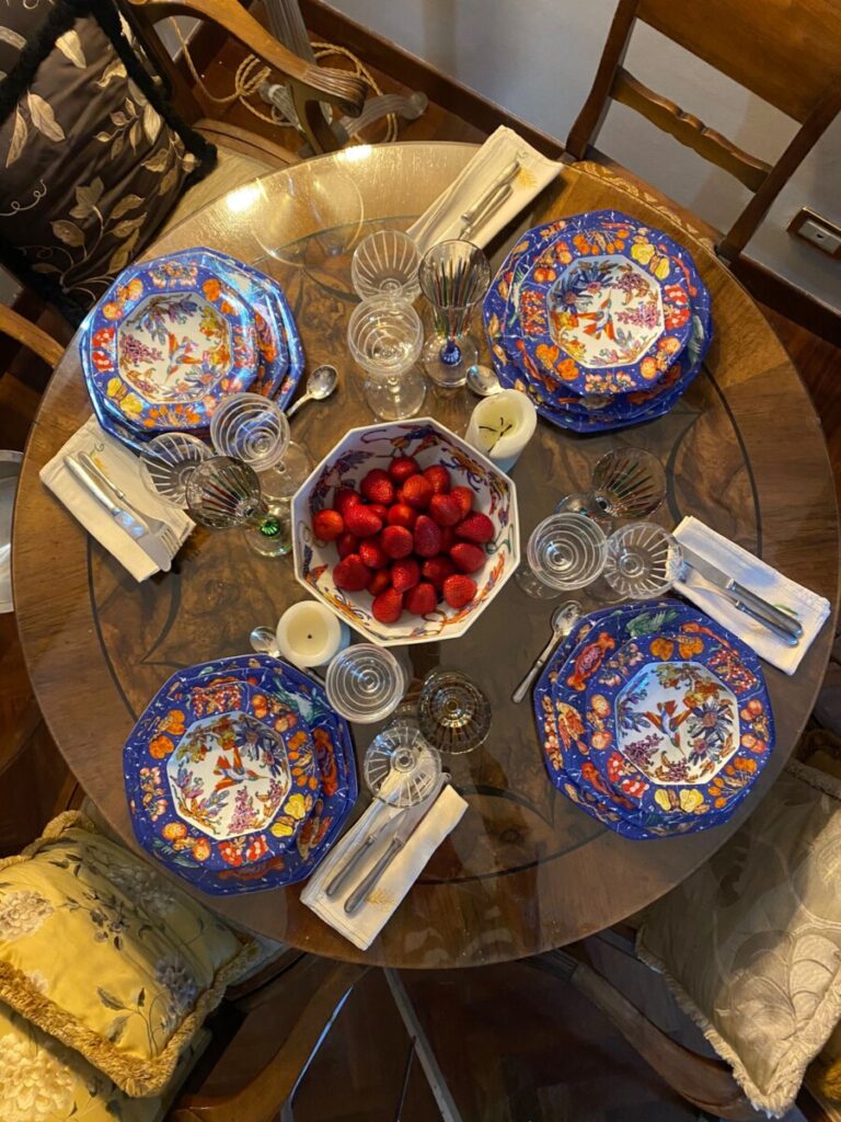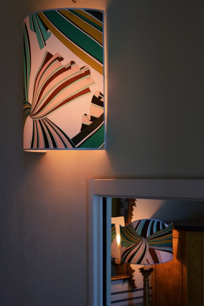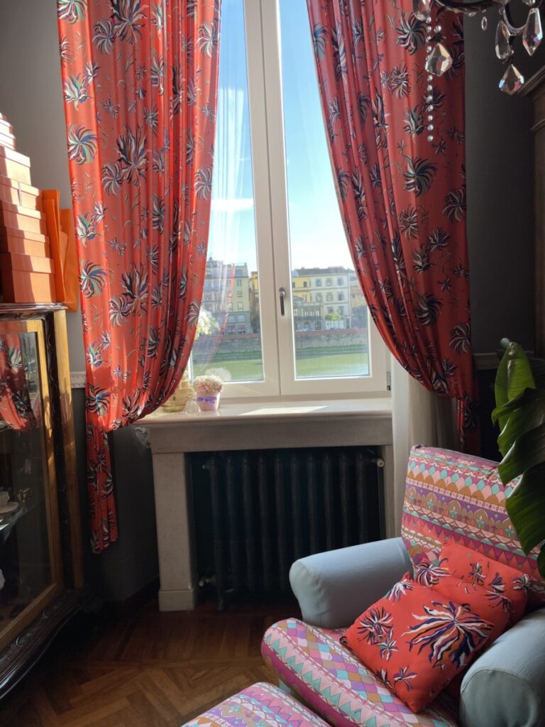 La luce del tardo pomeriggio entra radente nel salottino e esalta il tripudio di colori della tappezzeria, le fantasie dei foulard vintage di Hermes ed Emilio Pucci appesi alle pareti, la collezione di coralli e l’oggettistica dell’800 napoletano, i fiori freschi, il sottofondo del fiume che scorre.